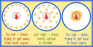 Chicks cannot regulate their own body temperature until they are around 12–14 days of age. Ideal body temperature must be attained by providing optimal environmental temperature. Preheating the house is vital as floor temperature at chick placement is important. Pre-heating the poultry house to about 33°C is advisable for chick placement. A single infra-red lamp is enough to heat up 50 chicks, whilst one drum heater will cater for 500 chicks. The normal body temperature of a broiler chicken is approximately 41°C. When the environmental temperature exceeds 35°C, the broiler is likely to experience heat stress. The longer the broiler is exposed to high temperatures, the greater the stress and its effects. Some effects of heat stress are experienced in the later stages of the broiler chicken, usually from 3 weeks going forward. For example ascites, one major cause of mortality at the later stage of the broiler induced by heat stress. Poor heat distribution can also have a negative result on bird uniformity. Priority ought to be taken to ensure even heat distribution within the brooder house. Bird behaviour is one indicator of heat distribution within the house.