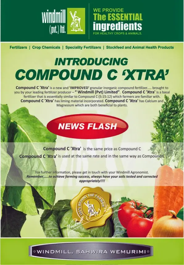 Compound C Xtra is a new and improved granular inorganic compound fertilizer courtesy of your leading fertilizer producer, Windmill (Pvt) Ltd, Zimbabwe. Compound C Xtra has the following NPK composition (5:15:12 11S 0.1B). In addition, it contains Calcium (6% Ca) and Magnesium (3% Mg), nutrients that are required by crop plants in large quantities for good growth and high yields. The raw materials from which these nutrients (Ca and Mg) are derived also have a liming effect which should be useful in neutralizing acidic soils. But farmers should note that compound C Xtra does not replace lime and, therefore, should still have their soils tested for pH and apply the appropriate lime where recommended.